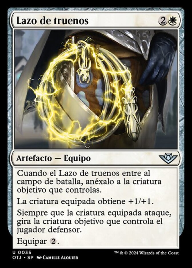 | Rules | When Thunder Lasso enters the battlefield, attach it to target creature you control. Equipped creature gets +1/+1. Whenever equipped creature attacks, tap target creature defending player controls. Equip |