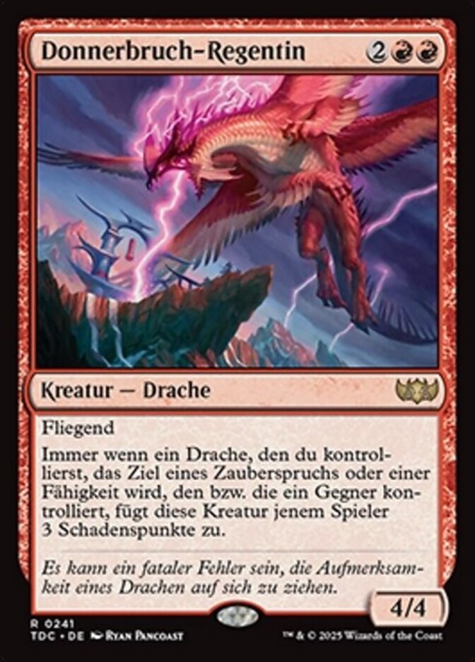 | Rules | Flying Whenever a Dragon you control becomes the target of a spell or ability an opponent controls, Thunderbreak Regent deals 3 damage to that player. |