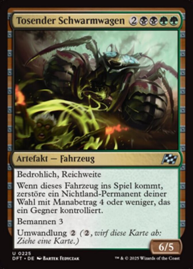 | Rules | Menace, reach When this Vehicle enters, destroy target nonland permanent an opponent controls with mana value 4 or less. Crew 3 Cycling (, Discard this card: Draw a card.) |