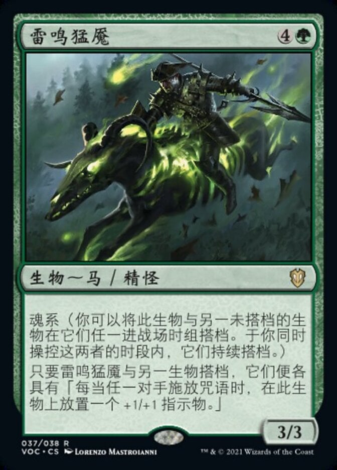 | Rules | Soulbond (You may pair this creature with another unpaired creature when either enters the battlefield. They remain paired for as long as you control both of them.) As long as Thundering Mightmare is paired with another creature, each of those creatures has "Whenever an opponent casts a spell, put a +1/+1 counter on this creature." |
