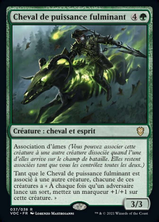 | Rules | Soulbond (You may pair this creature with another unpaired creature when either enters the battlefield. They remain paired for as long as you control both of them.) As long as Thundering Mightmare is paired with another creature, each of those creatures has "Whenever an opponent casts a spell, put a +1/+1 counter on this creature." |