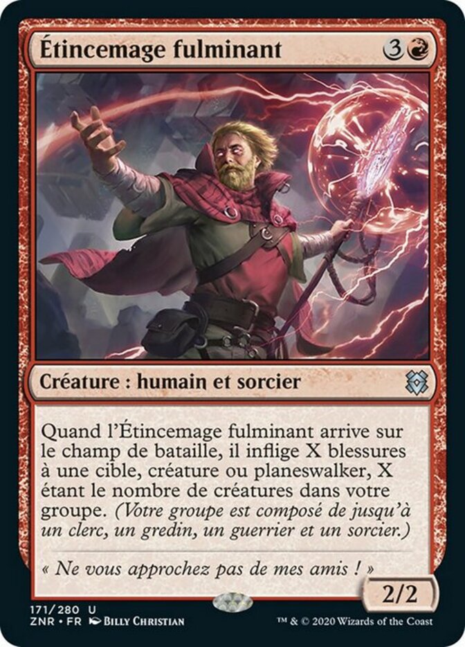 | Rules | When Thundering Sparkmage enters the battlefield, it deals X damage to target creature or planeswalker, where X is the number of creatures in your party. (Your party consists of up to one each of Cleric, Rogue, Warrior, and Wizard.) |
