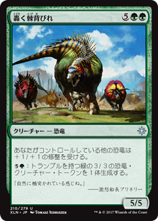 | Rules | Other Dinosaurs you control get +1/+1. : Create a 3/3 green Dinosaur creature token with trample. |