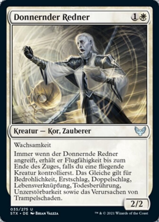 | Rules | Vigilance Whenever Thunderous Orator attacks, it gains flying until end of turn if you control a creature with flying. The same is true for first strike, double strike, deathtouch, indestructible, lifelink, menace, and trample. |
