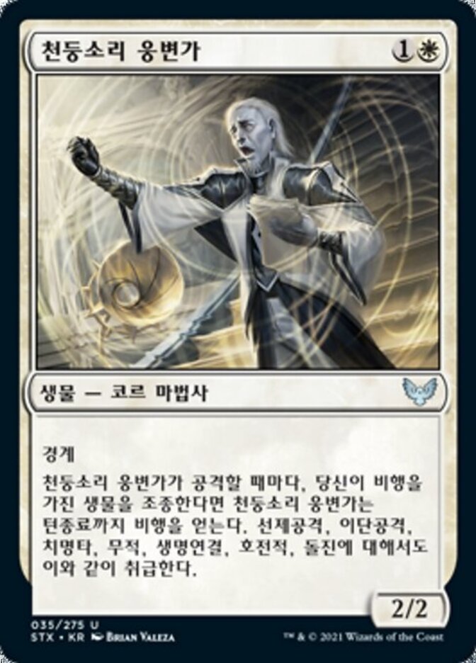 | Rules | Vigilance Whenever Thunderous Orator attacks, it gains flying until end of turn if you control a creature with flying. The same is true for first strike, double strike, deathtouch, indestructible, lifelink, menace, and trample. |