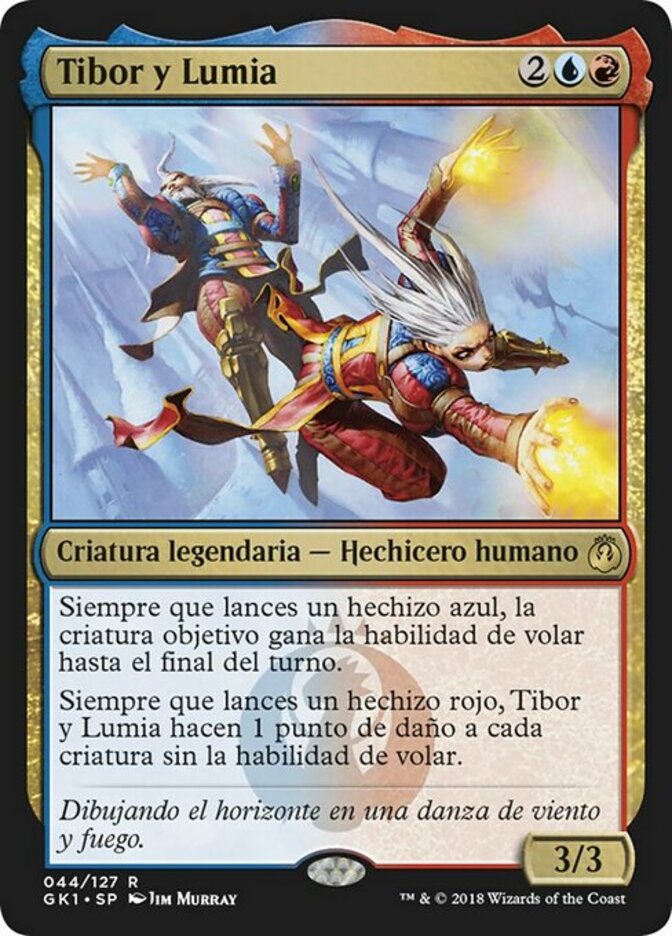 | Rules | Whenever you cast a blue spell, target creature gains flying until end of turn. Whenever you cast a red spell, Tibor and Lumia deals 1 damage to each creature without flying. |