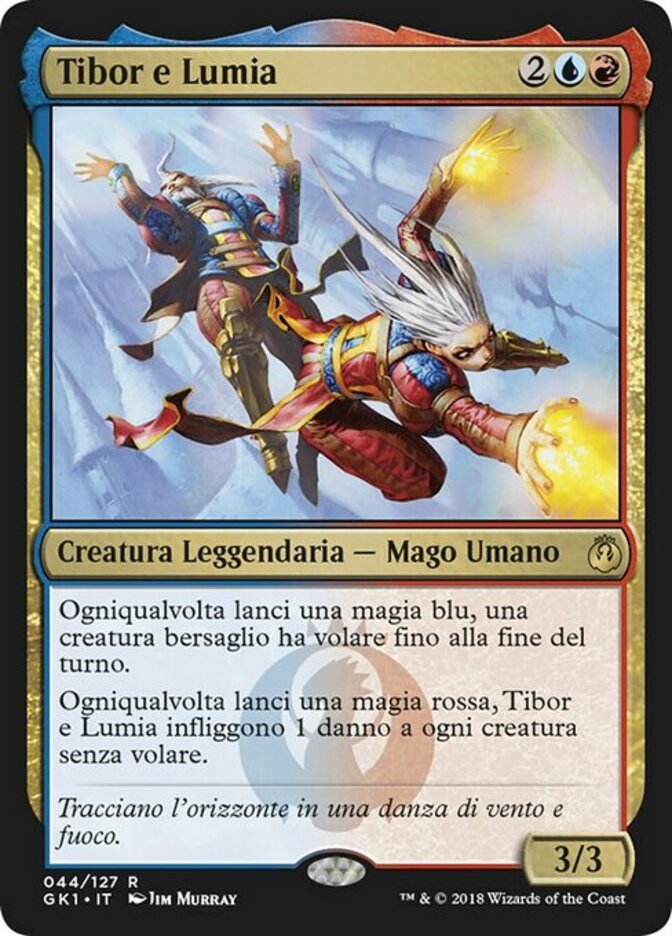 | Rules | Whenever you cast a blue spell, target creature gains flying until end of turn. Whenever you cast a red spell, Tibor and Lumia deals 1 damage to each creature without flying. |