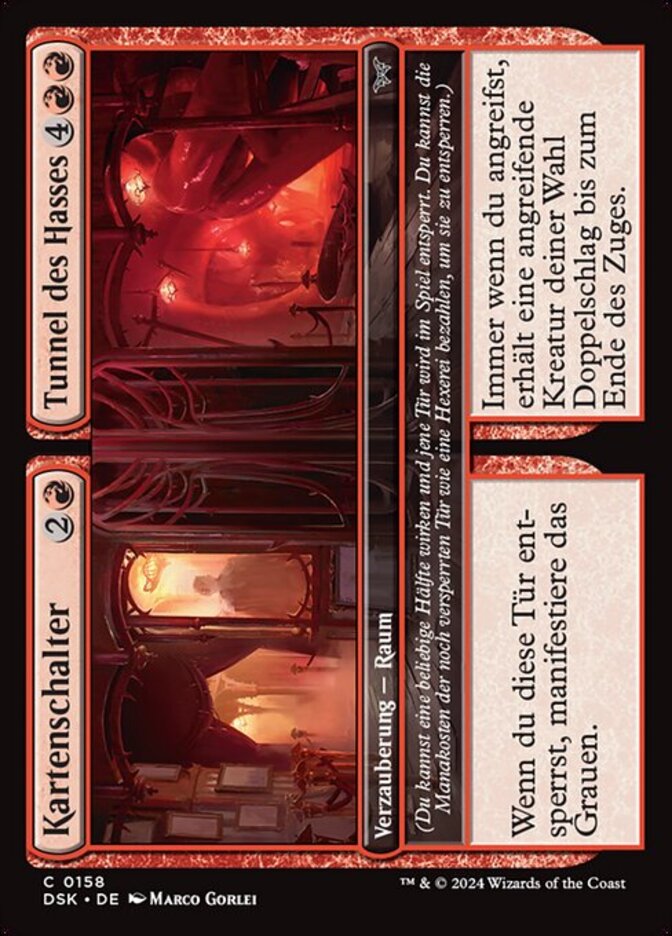 | Rules | (You may cast either half. That door unlocks on the battlefield. As a sorcery, you may pay the mana cost of a locked door to unlock it.) When you unlock this door, manifest dread. // (You may cast either half. That door unlocks on the battlefield. As a sorcery, you may pay the mana cost of a locked door to unlock it.) Whenever you attack, target attacking creature gains double strike until end of turn. |