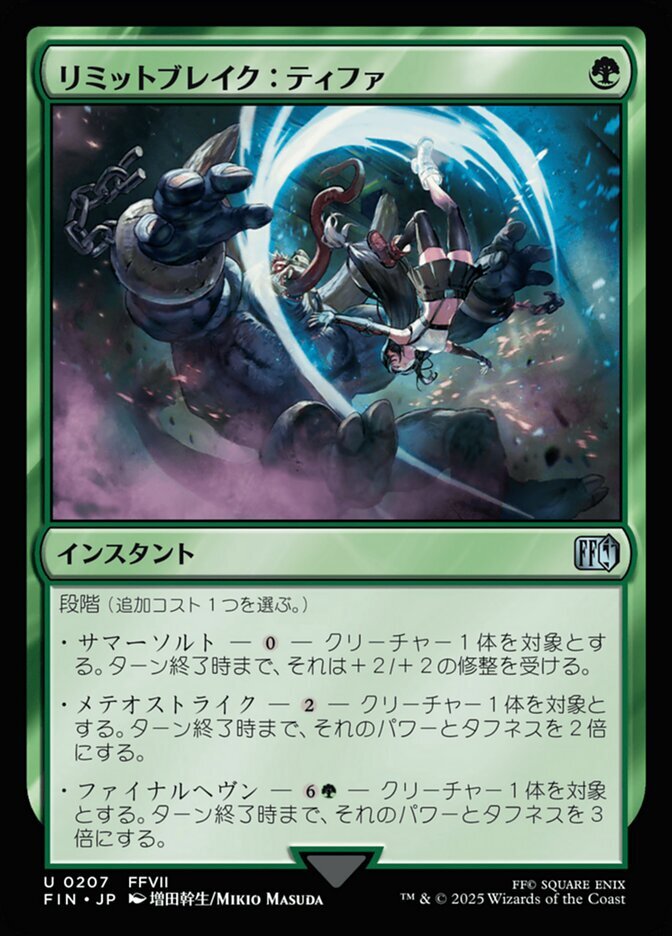 | Rules | Tiered (Choose one additional cost.) • Somersault — — Target creature gets +2/+2 until end of turn. • Meteor Strikes — — Double target creature's power and toughness until end of turn. • Final Heaven — — Triple target creature's power and toughness until end of turn. |