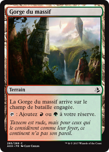 | Rules | Timber Gorge enters the battlefield tapped. : Add or . |