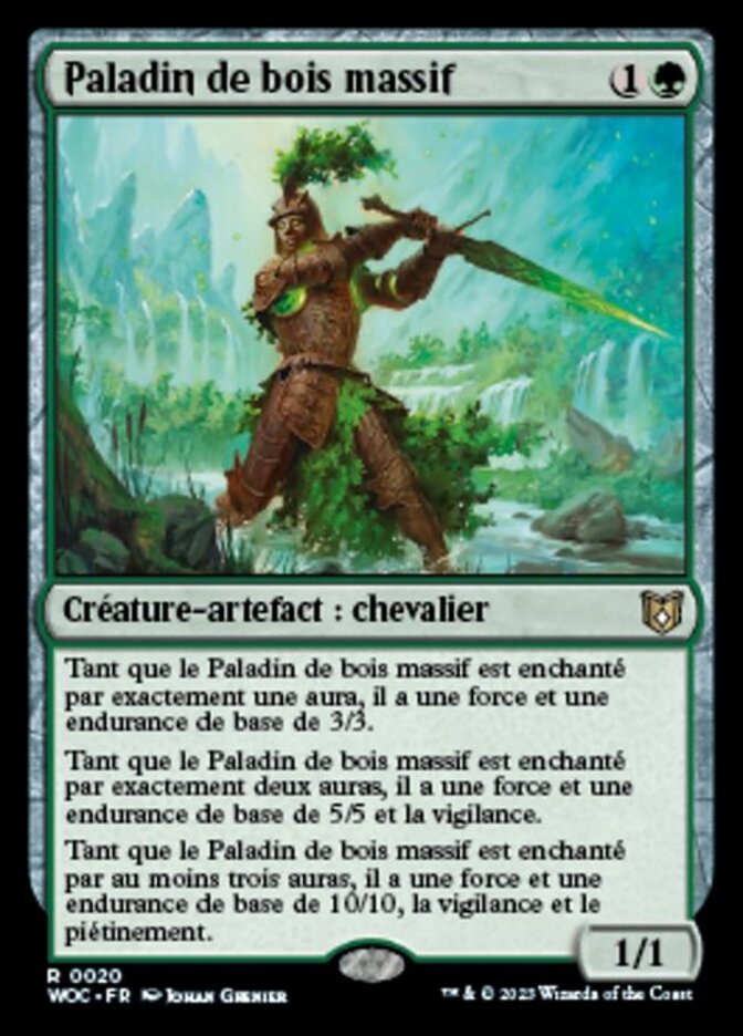 | Rules | As long as Timber Paladin is enchanted by exactly one Aura, it has base power and toughness 3/3. As long as Timber Paladin is enchanted by exactly two Auras, it has base power and toughness 5/5 and vigilance. As long as Timber Paladin is enchanted by three or more Auras, it has base power and toughness 10/10, vigilance, and trample. |