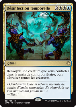 | Rules | Return a creature you control to its owner's hand, then destroy all creatures. |