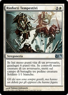 | Rules | If you have less life than an opponent, you gain 6 life. If you control fewer creatures than an opponent, create three 1/1 white Soldier creature tokens. |