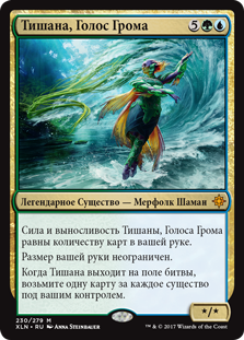 | Rules | Tishana, Voice of Thunder's power and toughness are each equal to the number of cards in your hand. You have no maximum hand size. When Tishana enters the battlefield, draw a card for each creature you control. |