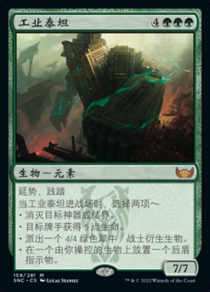 | Rules | Reach, trample When Titan of Industry enters the battlefield, choose two — • Destroy target artifact or enchantment. • Target player gains 5 life. • Create a 4/4 green Rhino Warrior creature token. • Put a shield counter on a creature you control. |