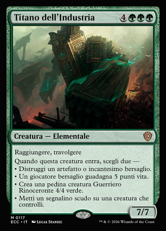 | Rules | Reach, trample When Titan of Industry enters the battlefield, choose two — • Destroy target artifact or enchantment. • Target player gains 5 life. • Create a 4/4 green Rhino Warrior creature token. • Put a shield counter on a creature you control. |