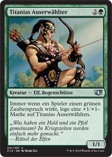 | Rules | Whenever a player casts a green spell, put a +1/+1 counter on Titania's Chosen. |