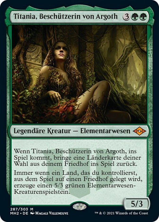 | Rules | When Titania, Protector of Argoth enters the battlefield, return target land card from your graveyard to the battlefield. Whenever a land you control is put into a graveyard from the battlefield, create a 5/3 green Elemental creature token. |