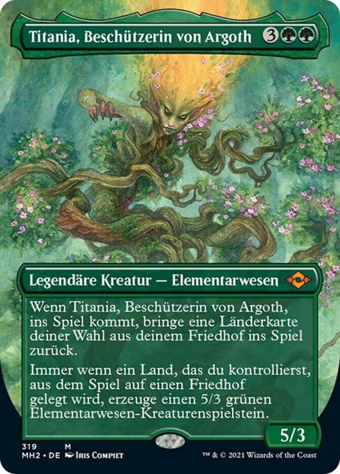 | Rules | When Titania, Protector of Argoth enters the battlefield, return target land card from your graveyard to the battlefield. Whenever a land you control is put into a graveyard from the battlefield, create a 5/3 green Elemental creature token. |