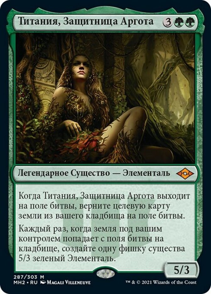 | Rules | When Titania, Protector of Argoth enters the battlefield, return target land card from your graveyard to the battlefield. Whenever a land you control is put into a graveyard from the battlefield, create a 5/3 green Elemental creature token. |