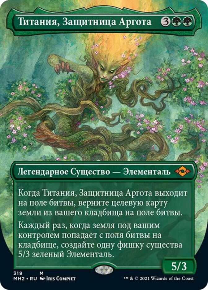 | Rules | When Titania, Protector of Argoth enters the battlefield, return target land card from your graveyard to the battlefield. Whenever a land you control is put into a graveyard from the battlefield, create a 5/3 green Elemental creature token. |
