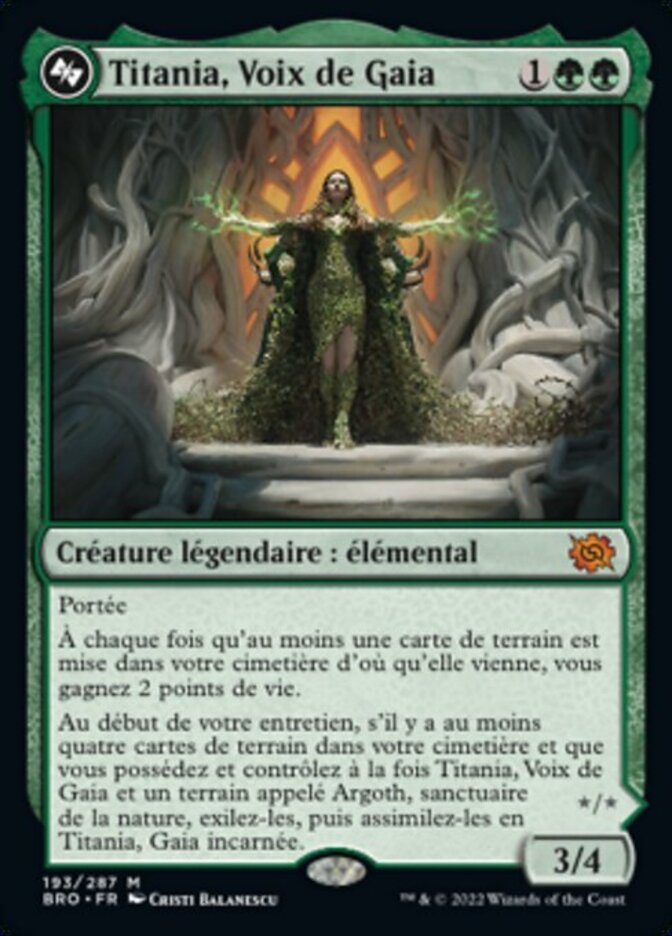 | Rules | Reach Whenever one or more land cards are put into your graveyard from anywhere, you gain 2 life. At the beginning of your upkeep, if there are four or more land cards in your graveyard and you both own and control Titania, Voice of Gaea and a land named Argoth, Sanctum of Nature, exile them, then meld them into Titania, Gaea Incarnate. |
