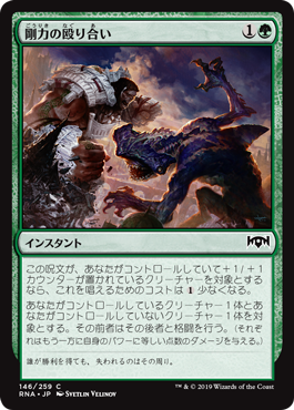 | Rules | This spell costs less to cast if it targets a creature you control with a +1/+1 counter on it. Target creature you control fights target creature you don't control. (Each deals damage equal to its power to the other.) |