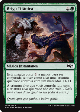 | Rules | This spell costs less to cast if it targets a creature you control with a +1/+1 counter on it. Target creature you control fights target creature you don't control. (Each deals damage equal to its power to the other.) |