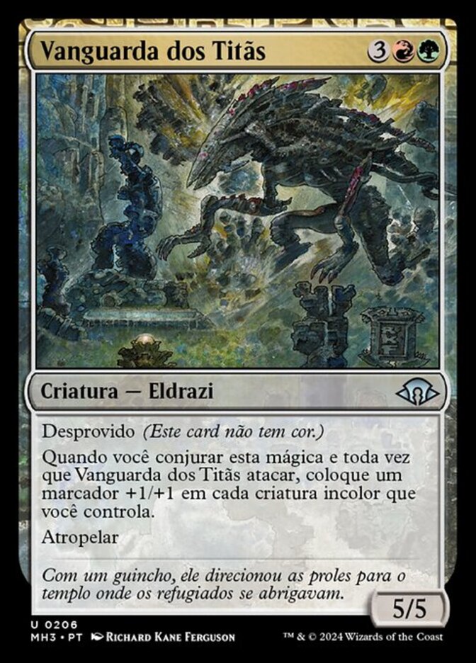 | Rules | Devoid (This card has no color.) When you cast this spell and whenever Titans' Vanguard attacks, put a +1/+1 counter on each colorless creature you control. Trample |