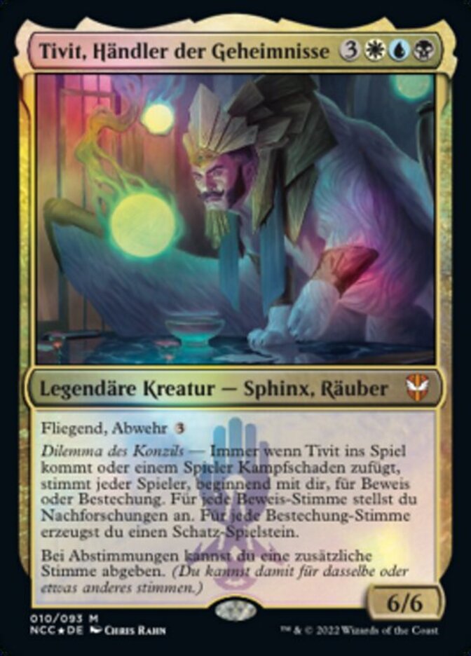| Rules | Flying, ward Council's dilemma — Whenever Tivit enters the battlefield or deals combat damage to a player, starting with you, each player votes for evidence or bribery. For each evidence vote, investigate. For each bribery vote, create a Treasure token. While voting, you may vote an additional time. (The votes can be for different choices or for the same choice.) |