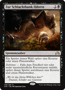 | Rules | Target player sacrifices a creature or planeswalker. Delirium — If there are four or more card types among cards in your graveyard, instead that player sacrifices a creature and a planeswalker. |