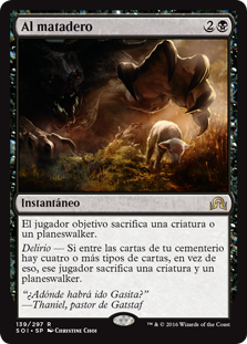 Delirium — If there are four or more card types among cards in your graveyard, instead that player sacrifices a creature and a planeswalker.