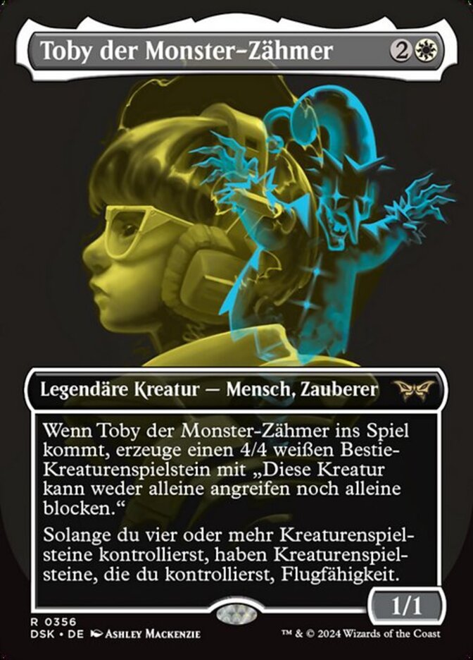 | Rules | When Toby, Beastie Befriender enters, create a 4/4 white Beast creature token with "This creature can't attack or block alone." As long as you control four or more creature tokens, creature tokens you control have flying. |
