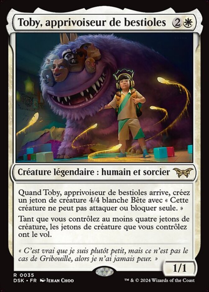 | Rules | When Toby, Beastie Befriender enters, create a 4/4 white Beast creature token with "This creature can't attack or block alone." As long as you control four or more creature tokens, creature tokens you control have flying. |