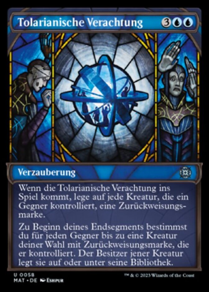| Rules | When Tolarian Contempt enters the battlefield, put a rejection counter on each creature your opponents control. At the beginning of your end step, for each opponent, choose up to one target creature they control with a rejection counter on it. That creature's owner puts it on the top or bottom of their library. |