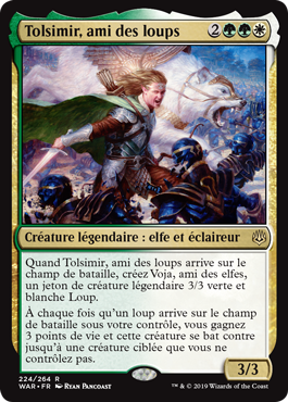 | Rules | When Tolsimir, Friend to Wolves enters the battlefield, create Voja, Friend to Elves, a legendary 3/3 green and white Wolf creature token. Whenever a Wolf enters the battlefield under your control, you gain 3 life and that creature fights up to one target creature you don't control. |
