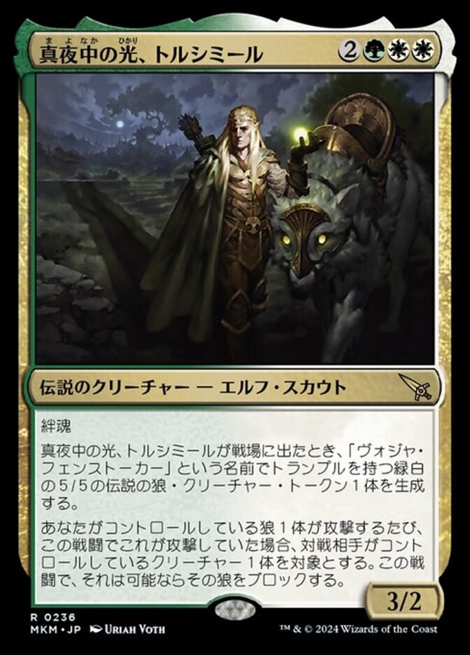 | Rules | Lifelink When Tolsimir, Midnight's Light enters the battlefield, create Voja Fenstalker, a legendary 5/5 green and white Wolf creature token with trample. Whenever a Wolf you control attacks, if Tolsimir attacked this combat, target creature an opponent controls blocks that Wolf this combat if able. |