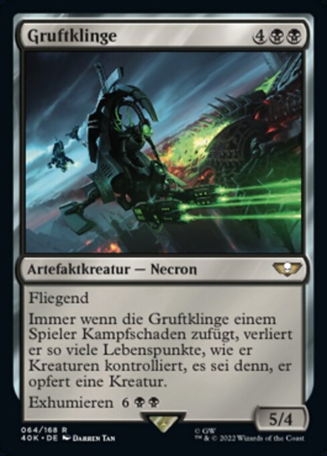 | Rules | Flying Whenever Tomb Blade deals combat damage to a player, that player loses life equal to the number of creatures they control unless they sacrifice a creature. Unearth |