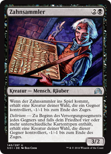 | Rules | When Tooth Collector enters the battlefield, target creature an opponent controls gets -1/-1 until end of turn. Delirium — At the beginning of each opponent's upkeep, if there are four or more card types among cards in your graveyard, target creature that player controls gets -1/-1 until end of turn. |