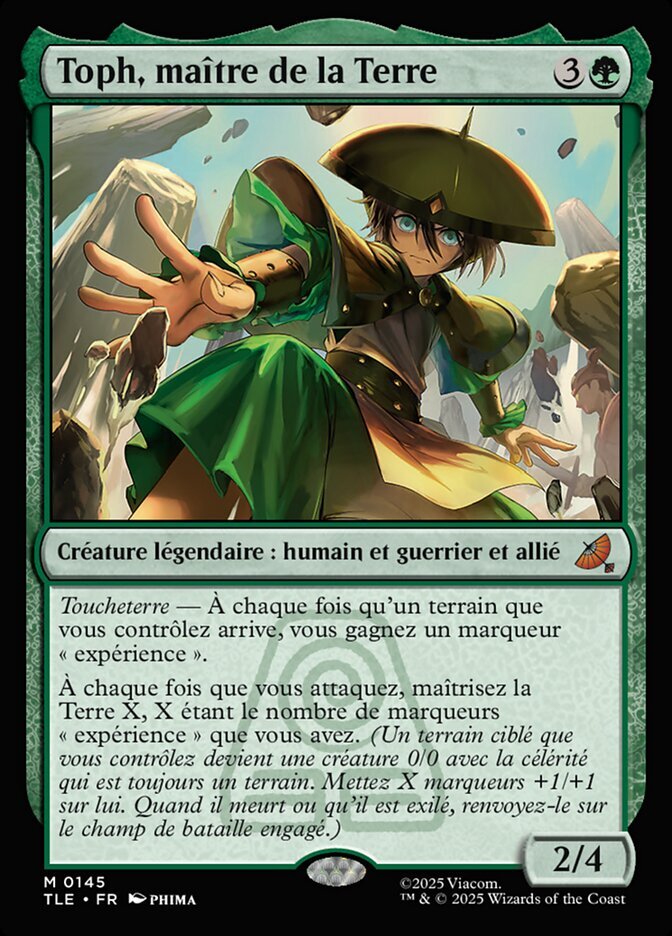 | Rules | Landfall — Whenever a land you control enters, you get an experience counter. Whenever you attack, earthbend X, where X is the number of experience counters you have. (Target land you control becomes a 0/0 creature with haste that's still a land. Put X +1/+1 counters on it. When it dies or is exiled, return it to the battlefield tapped.) |