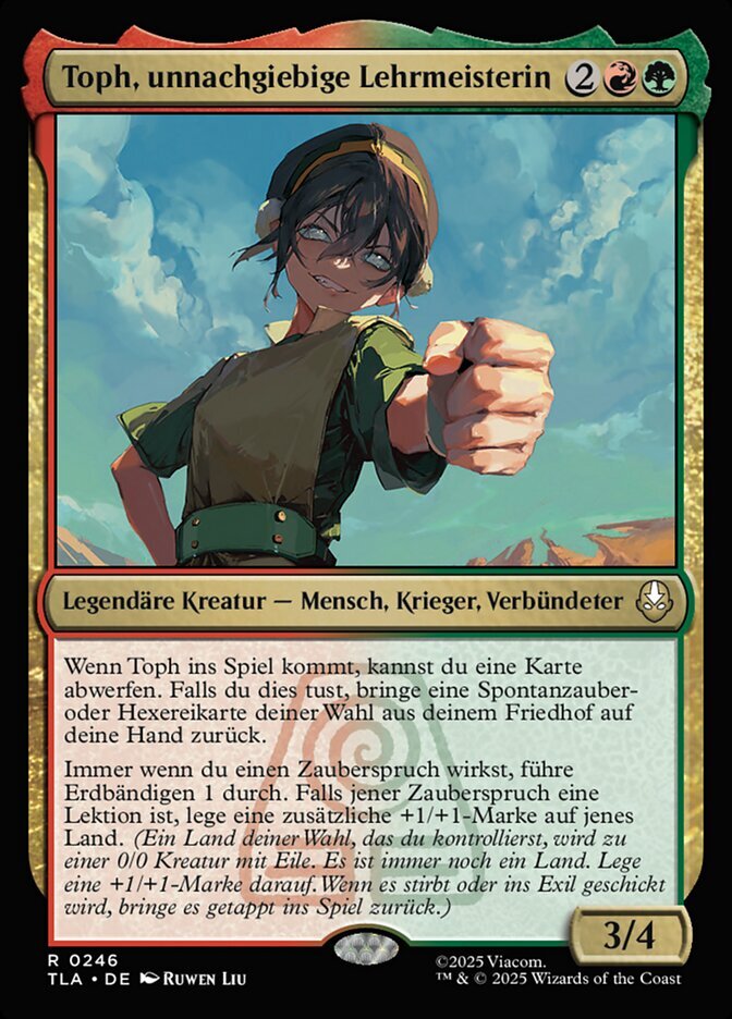 | Rules | When Toph enters, you may discard a card. If you do, return target instant or sorcery card from your graveyard to your hand. Whenever you cast a spell, earthbend 1. If that spell is a Lesson, put an additional +1/+1 counter on that land. (Target land you control becomes a 0/0 creature with haste that's still a land. Put a +1/+1 counter on it. When it dies or is exiled, return it to the battlefield tapped.) |