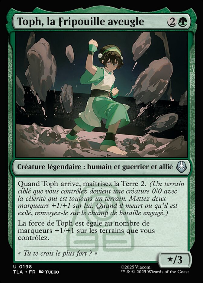 | Rules | When Toph enters, earthbend 2. (Target land you control becomes a 0/0 creature with haste that's still a land. Put two +1/+1 counters on it. When it dies or is exiled, return it to the battlefield tapped.) Toph's power is equal to the number of +1/+1 counters on lands you control. |