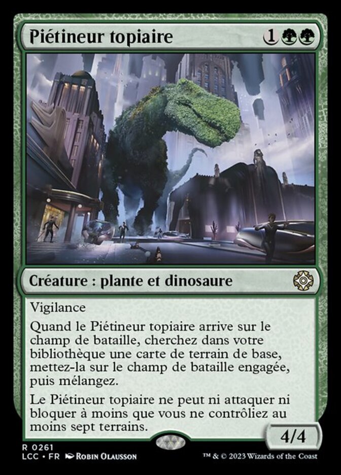 | Rules | Vigilance When Topiary Stomper enters the battlefield, search your library for a basic land card, put it onto the battlefield tapped, then shuffle. Topiary Stomper can't attack or block unless you control seven or more lands. |