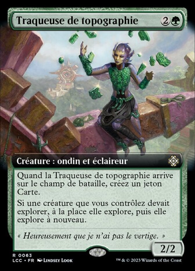 | Rules | When Topography Tracker enters the battlefield, create a Map token. (It's an artifact with ", , Sacrifice this artifact: Target creature you control explores. Activate only as a sorcery.") If a creature you control would explore, instead it explores, then it explores again. |