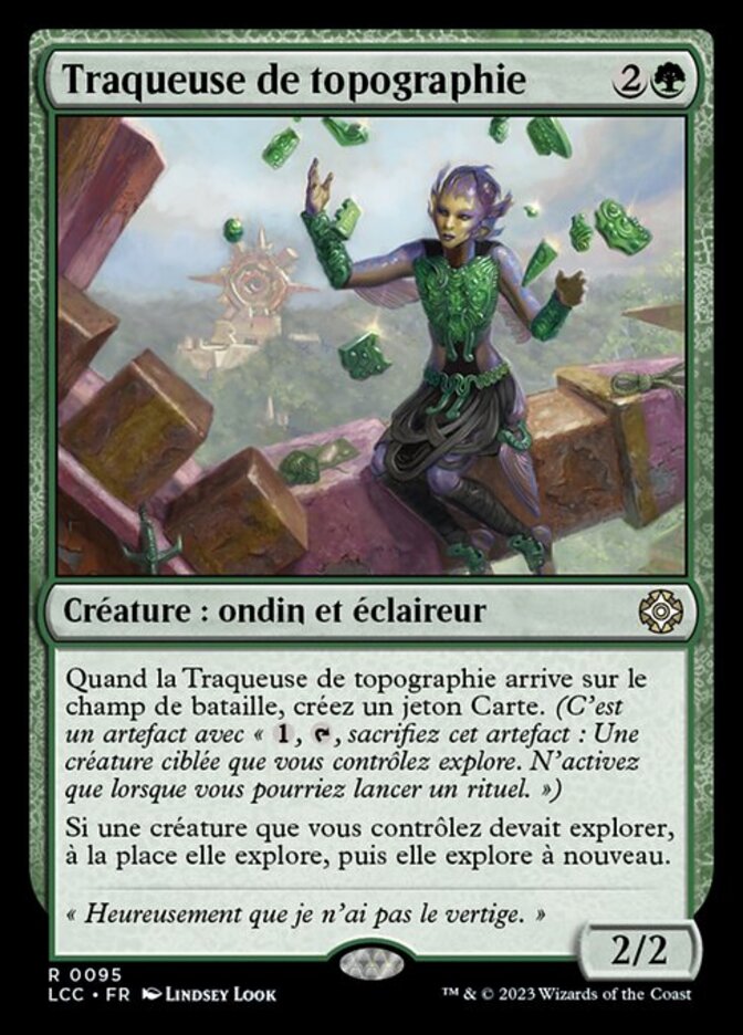 | Rules | When Topography Tracker enters the battlefield, create a Map token. (It's an artifact with ", , Sacrifice this artifact: Target creature you control explores. Activate only as a sorcery.") If a creature you control would explore, instead it explores, then it explores again. |