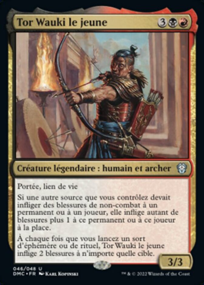 | Rules | Reach, lifelink If another source you control would deal noncombat damage to a permanent or player, it deals that much damage plus 1 to that permanent or player instead. Whenever you cast an instant or sorcery spell, Tor Wauki the Younger deals 2 damage to any target. |