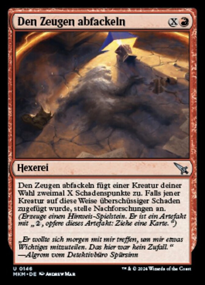 | Rules | Torch the Witness deals twice X damage to target creature. If excess damage was dealt to that creature this way, investigate. (Create a Clue token. It's an artifact with ", Sacrifice this artifact: Draw a card.") |