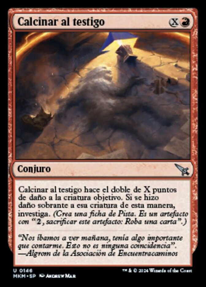 | Rules | Torch the Witness deals twice X damage to target creature. If excess damage was dealt to that creature this way, investigate. (Create a Clue token. It's an artifact with ", Sacrifice this artifact: Draw a card.") |
