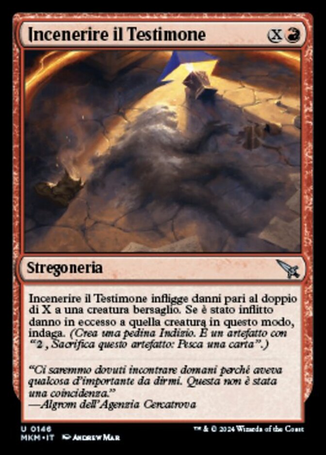 | Rules | Torch the Witness deals twice X damage to target creature. If excess damage was dealt to that creature this way, investigate. (Create a Clue token. It's an artifact with ", Sacrifice this artifact: Draw a card.") |
