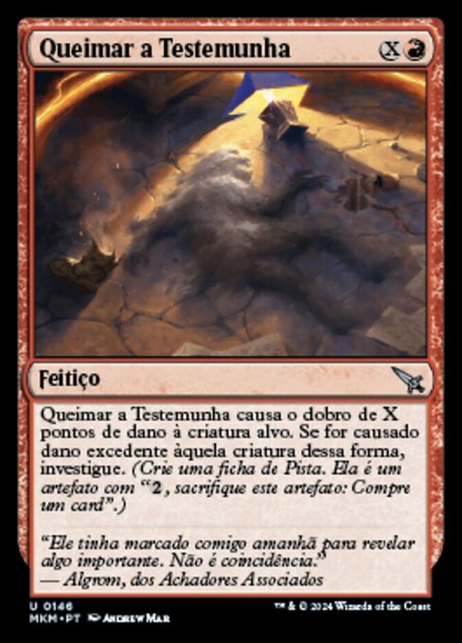 | Rules | Torch the Witness deals twice X damage to target creature. If excess damage was dealt to that creature this way, investigate. (Create a Clue token. It's an artifact with ", Sacrifice this artifact: Draw a card.") |